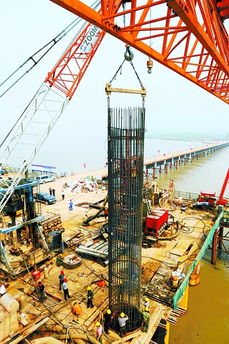5月3日,鄭州桃花峪黃河公路大橋工程建設(shè)現(xiàn)場熱火朝天。桃花峪黃河公路大橋是鄭州市境內(nèi)規(guī)劃的第四座跨黃河公路大橋,設(shè)計(jì)全長7691.5米,全線采用雙向六車道高速公路技術(shù)標(biāo)準(zhǔn),工程計(jì)劃于2013年4月完工。 新華社發(fā)